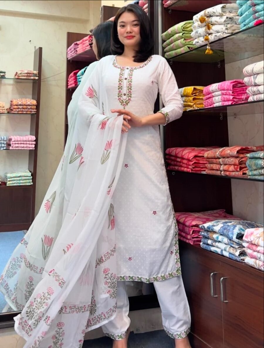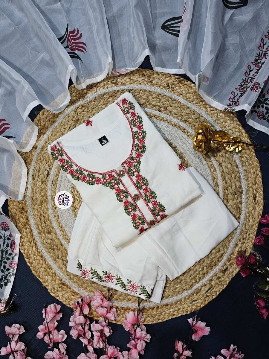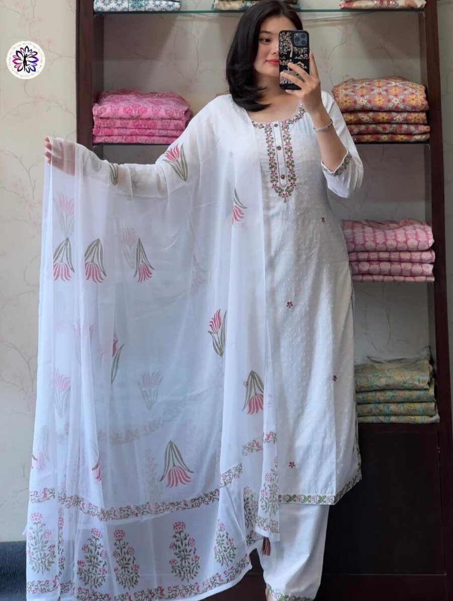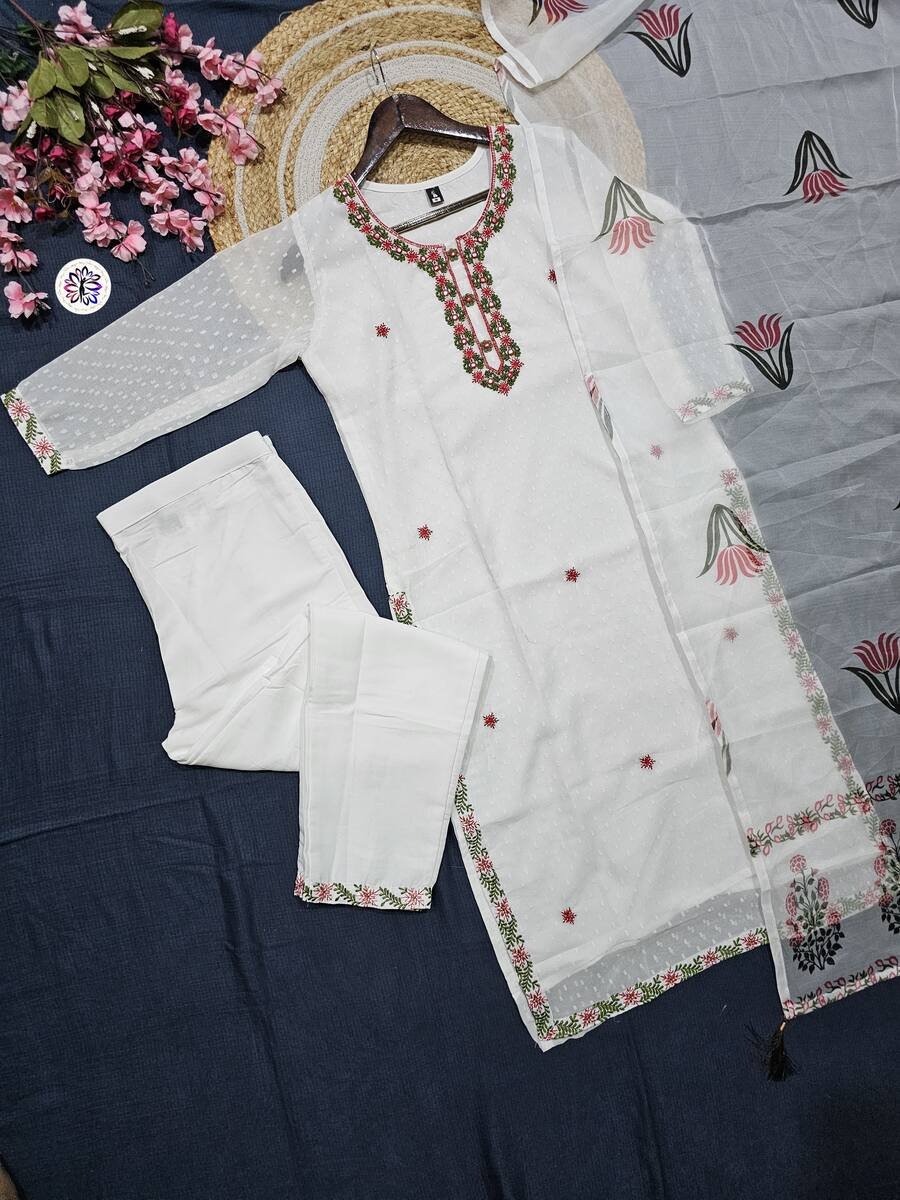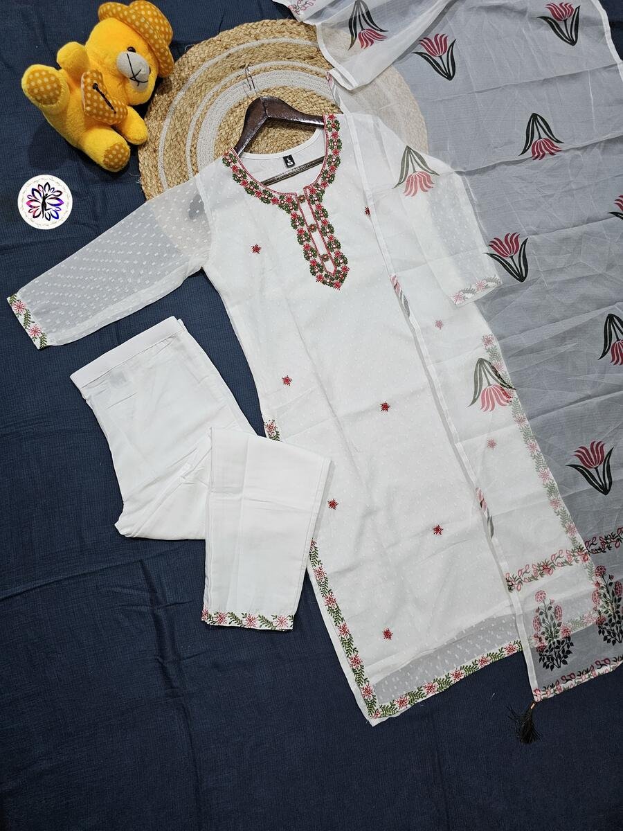 TRANDING VISCOSE CHANDERI EMBROIDERY WORK TOP BOTTOM WITH DUPATTA WHITE