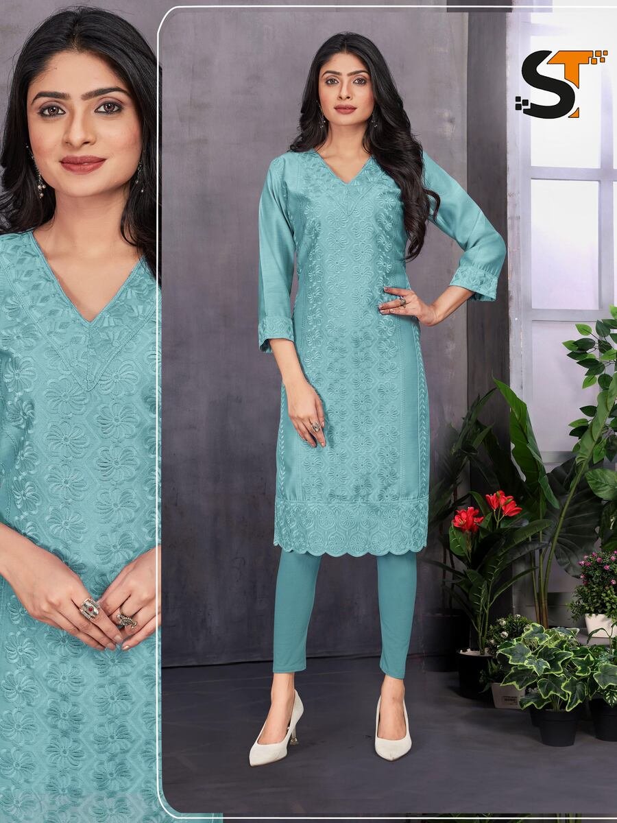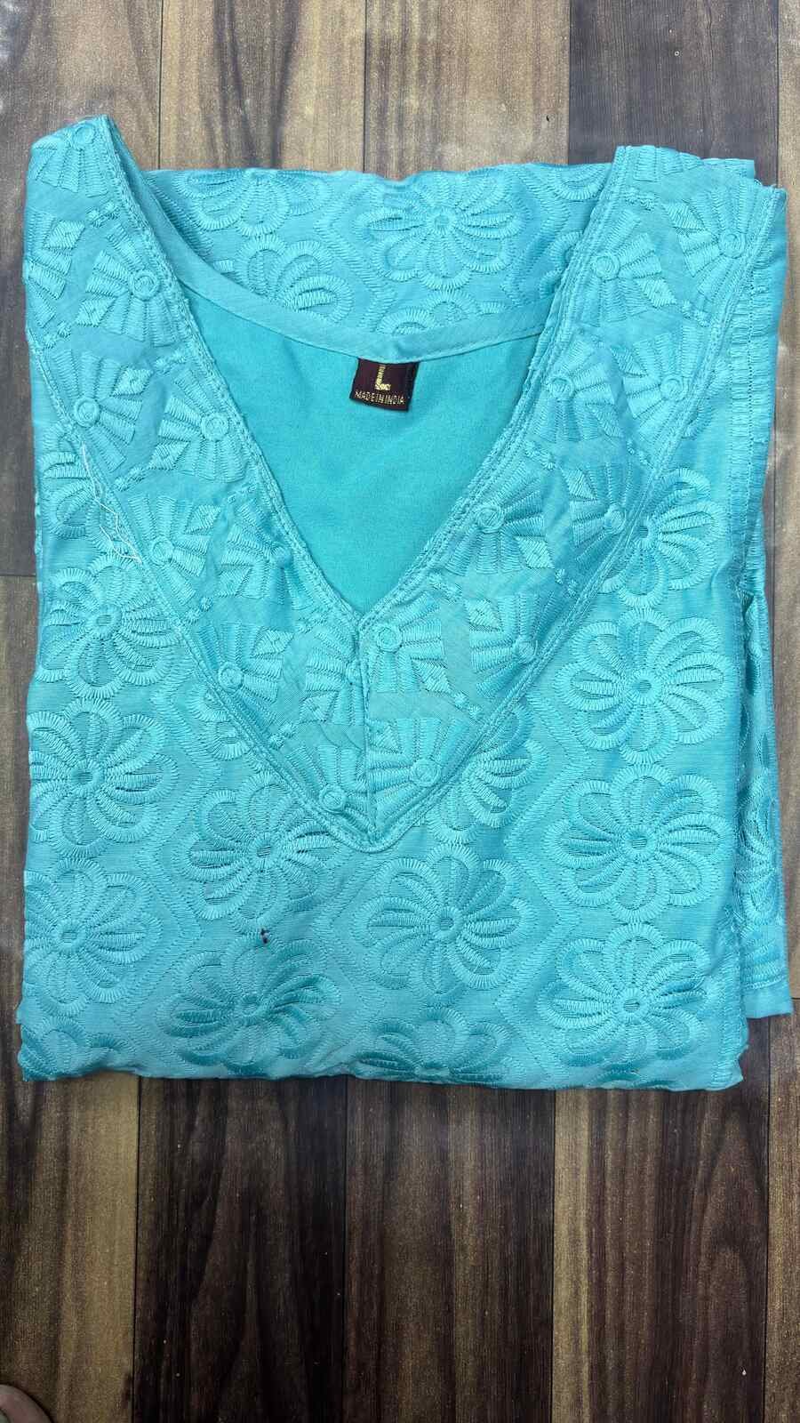 TREANDING CHANDERI CHICKENKARI WORK READY TO WEAR KURTI SKY