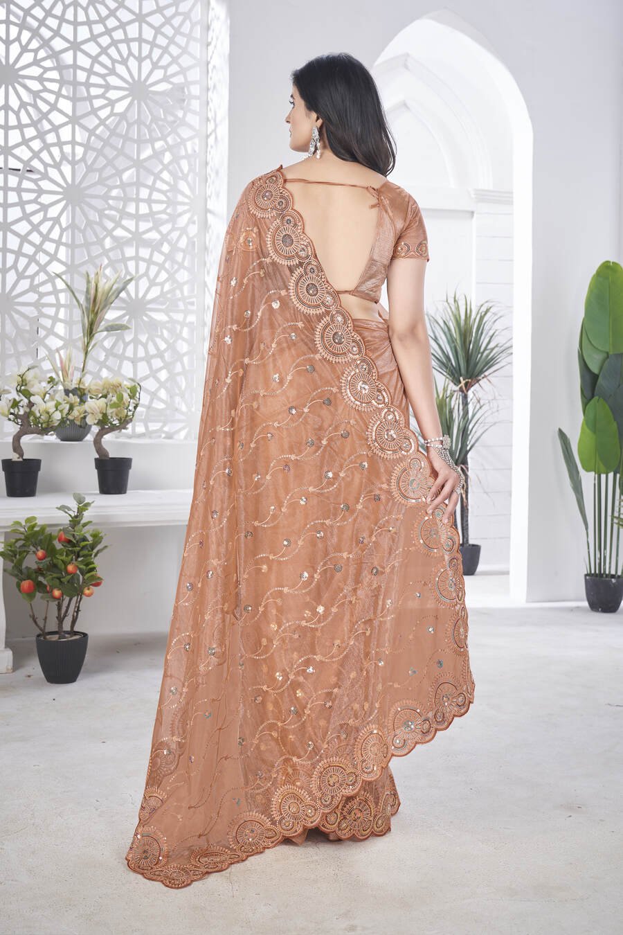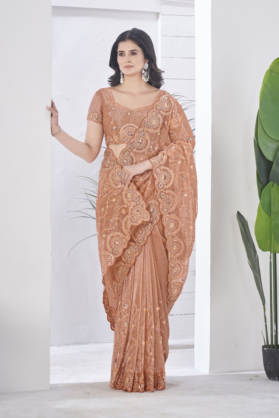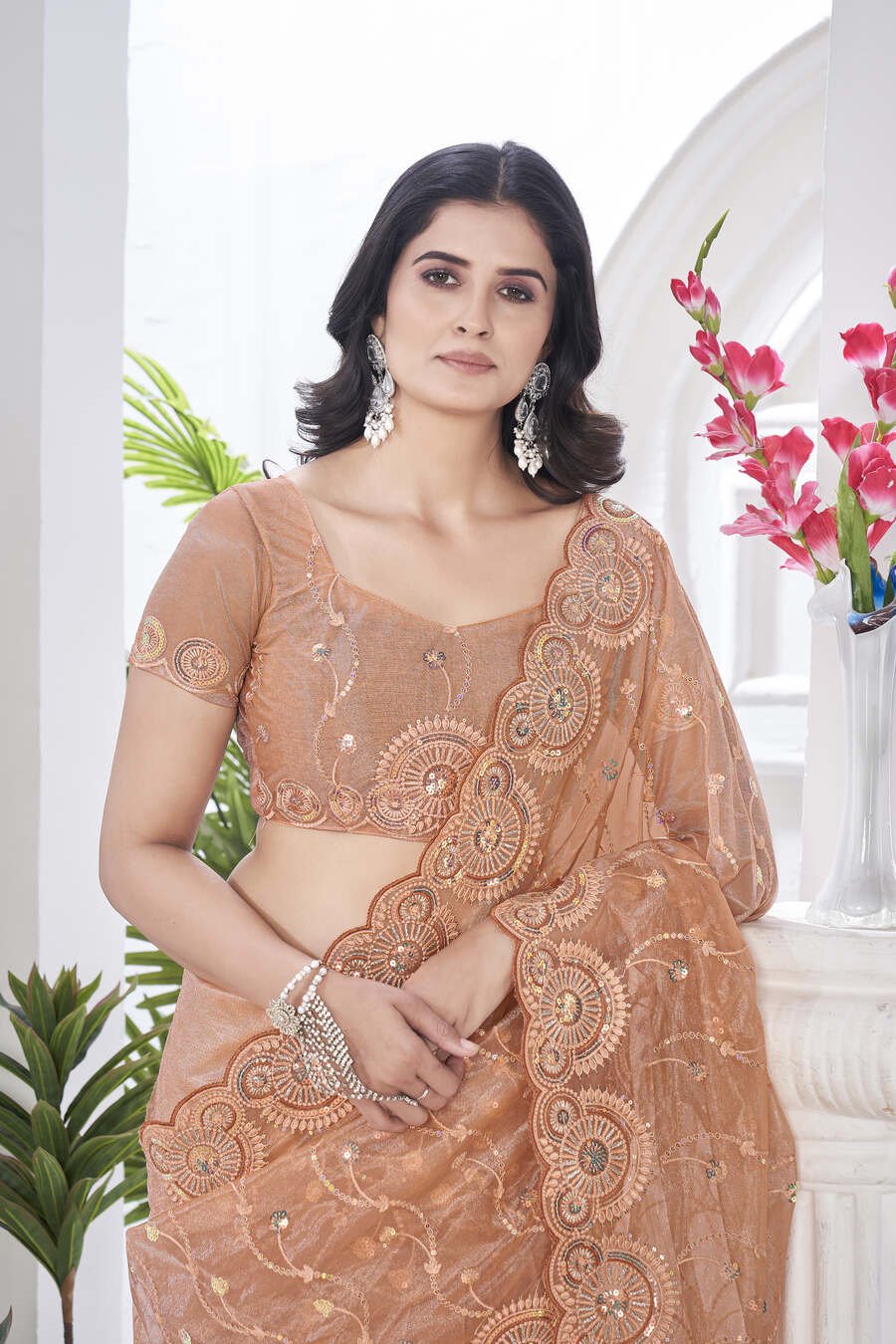 TRENDING BUTTERFLY NET EMBROIDERY WITH MULTI COLOUR THREAD AND STONEWORK SAREE WITH UNSTITCHED BLOUSE ORANGE