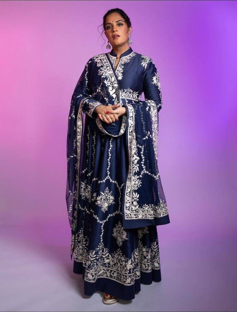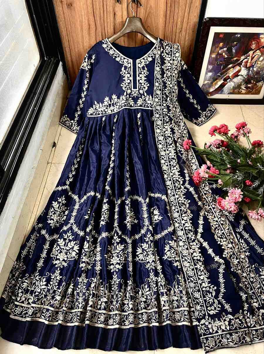 TRENDING CHINON SILK EMBROIDERY WORK FLAIRED GOWN WITH DUPATTA NAVY BLUE