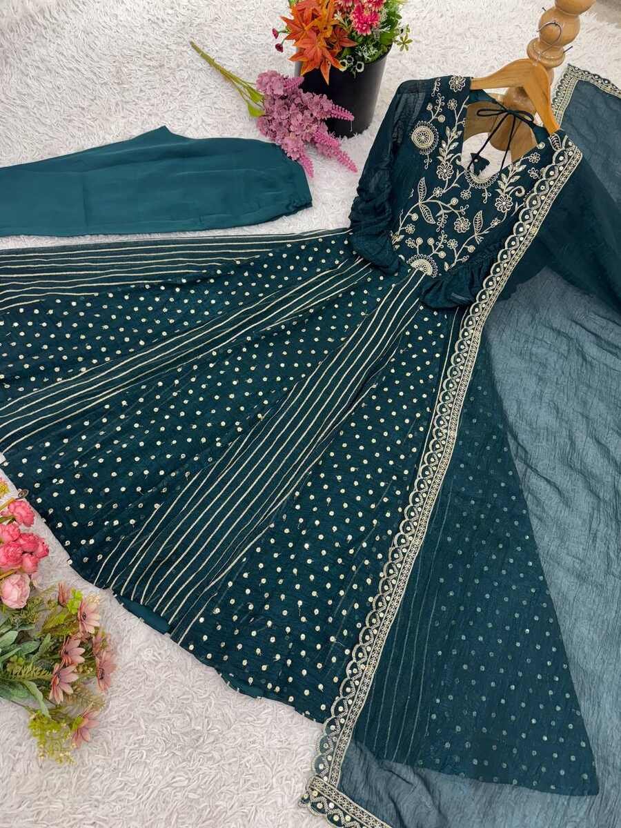 TRENDING CRUNCHY SILK EMBROIDERY SEQUENCE WORK GOWN BOTTOM WITH DUPATTA TEAL