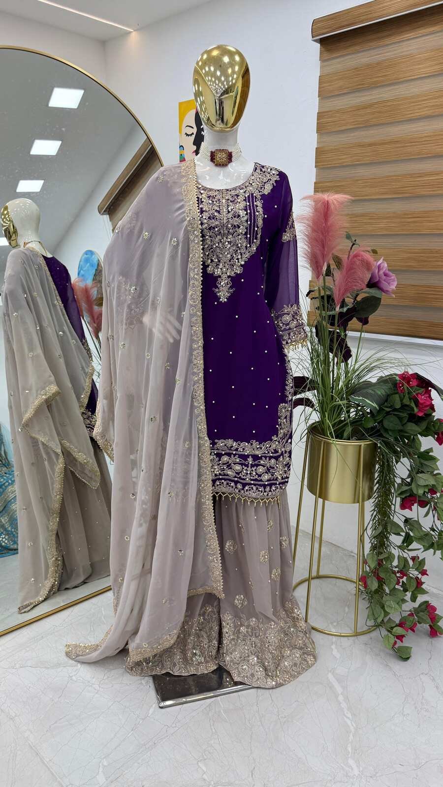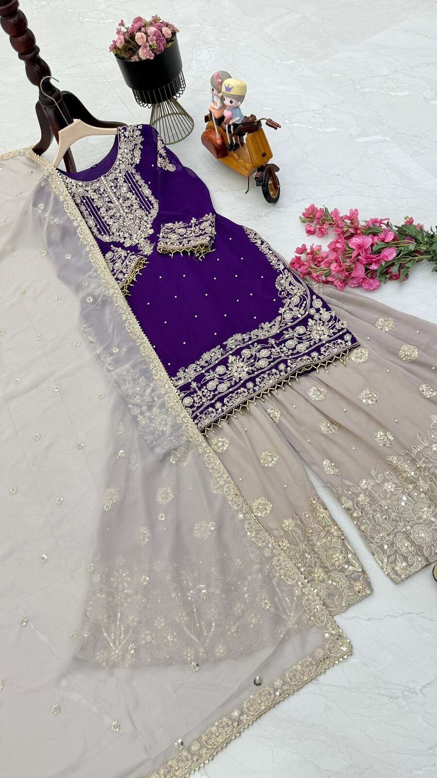 TRENDING GEORGETTE CODING SEQUENCE EMBROIDERY WORK TOP SHARARA WITH DUPATTA PURPLE