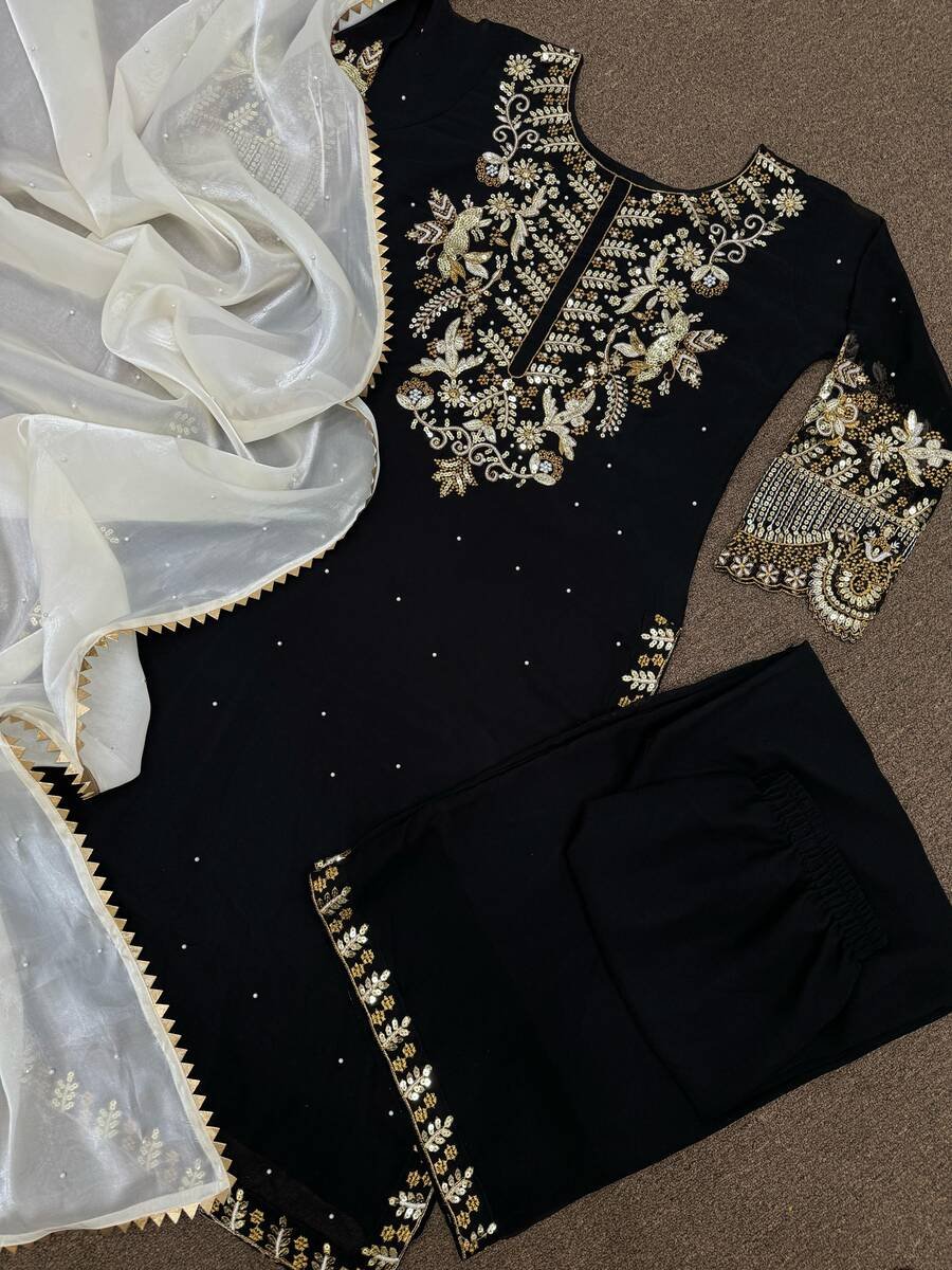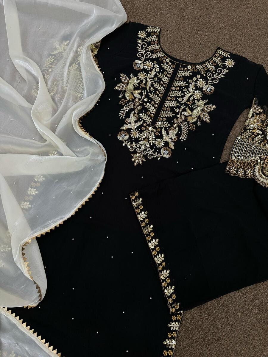 TRENDING GEORGETTE EMBROIDERY SEQUENCE WORK TOP PALAZZO WITH DUPATTA BLACK