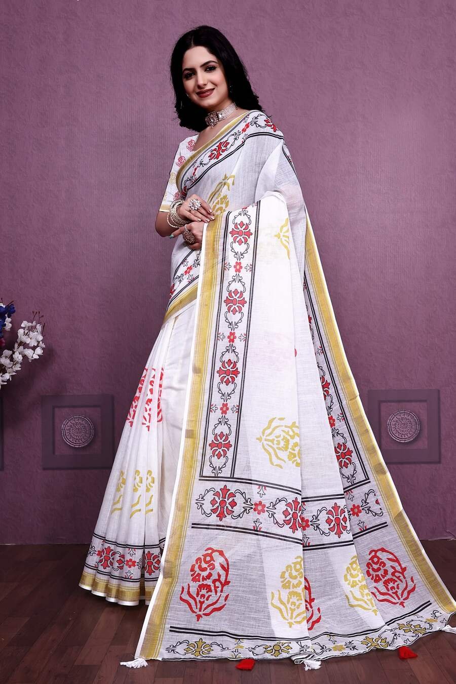 TRENDING HANDLOOM LINEN COTTON DIGITAL PRINT GOLD ZARI BORDER WORK SAREE WITH UNSTITCHED BLOUSE WHITE
