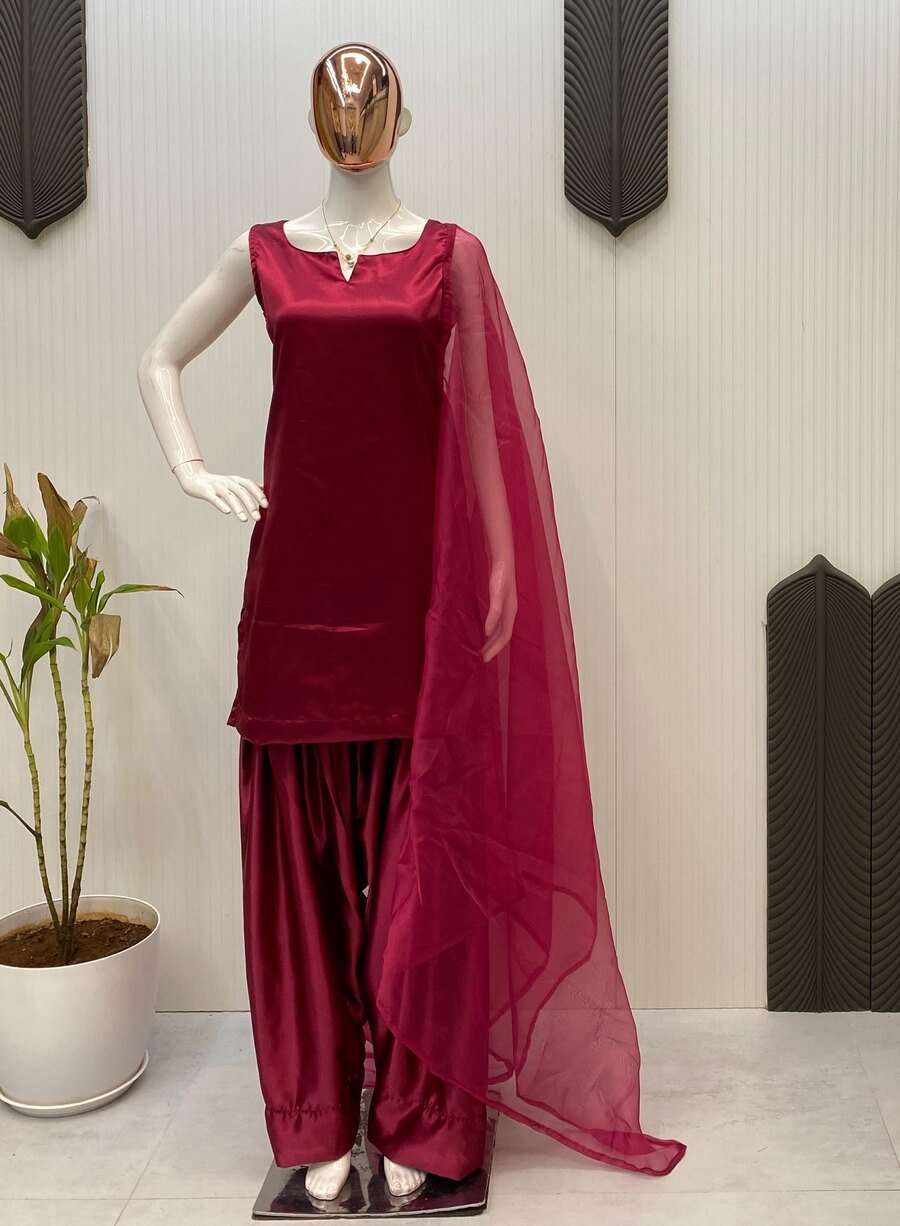 TRENDING MOSS SATIN PLAIN TOP PATIYALA WITH DUPATTA MAROON