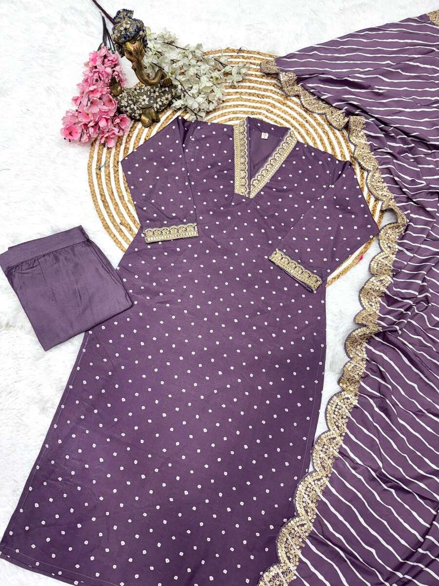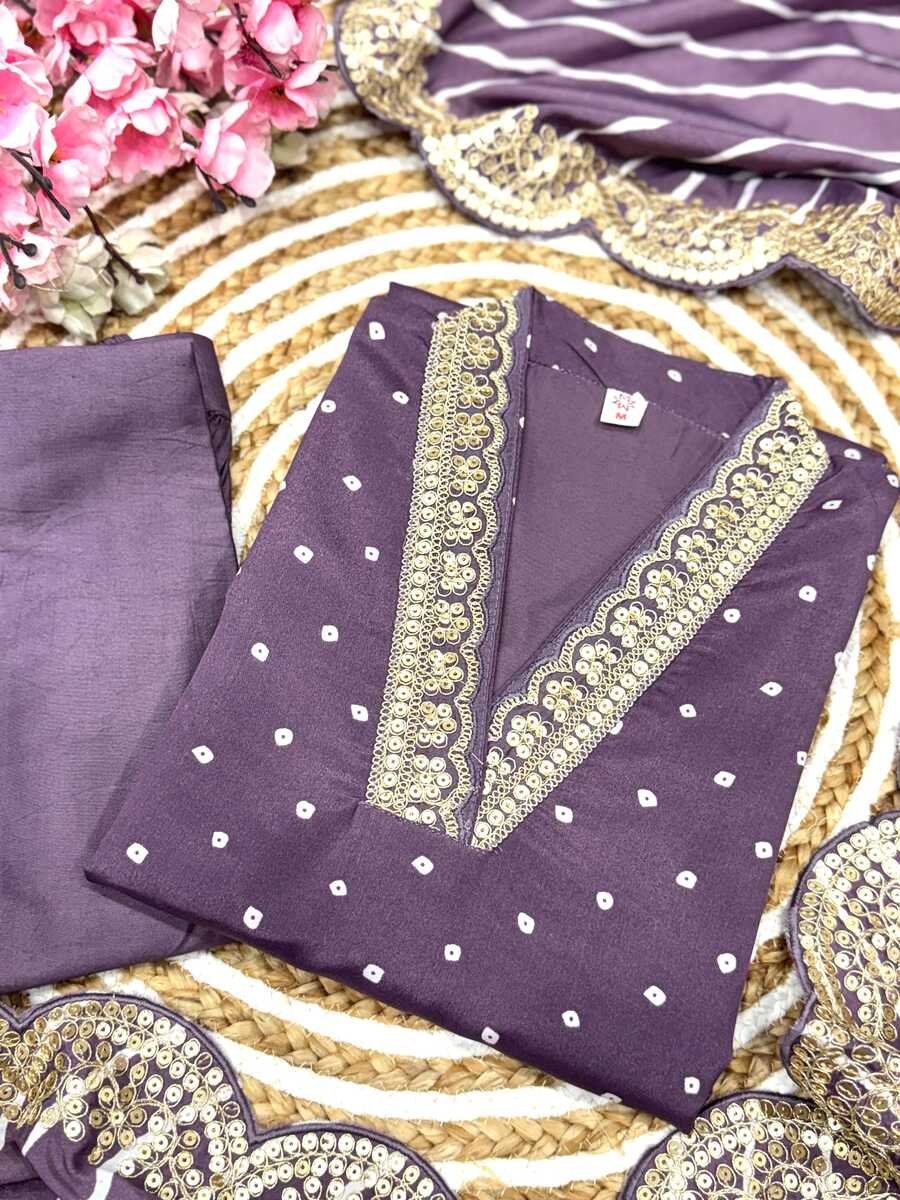TRENDING MUSLIN PRINTED EMBROIDERY WORK TOP BOTTOM WITH DUPATTA LAVENDER
