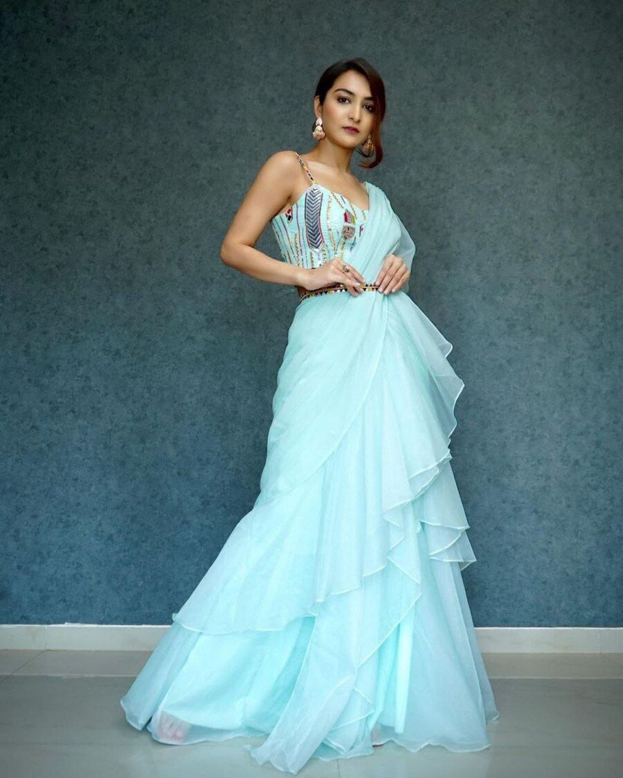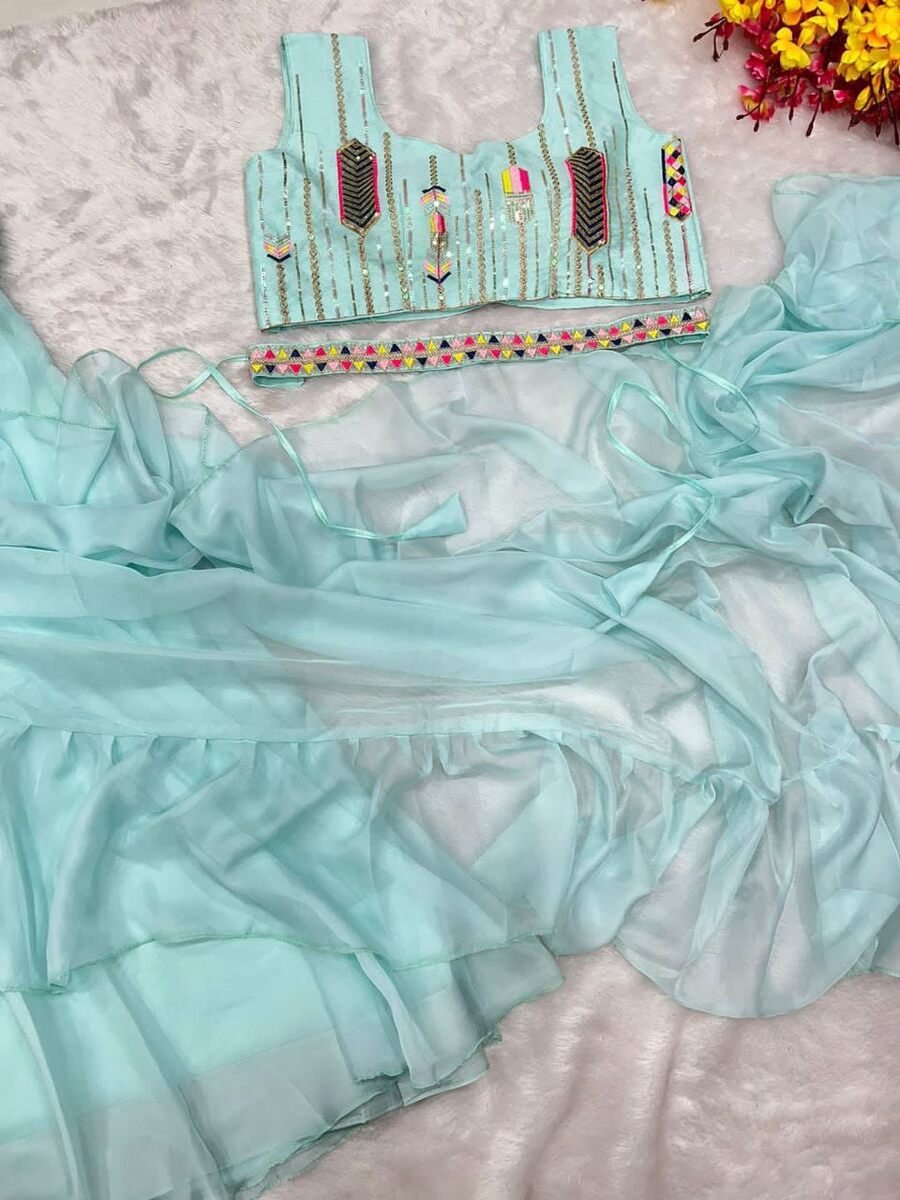 TRENDING ORGANZA PLAIN RUFFLE WORK LEHENGA SAREE WITH STITCHED BLOUSE SKY