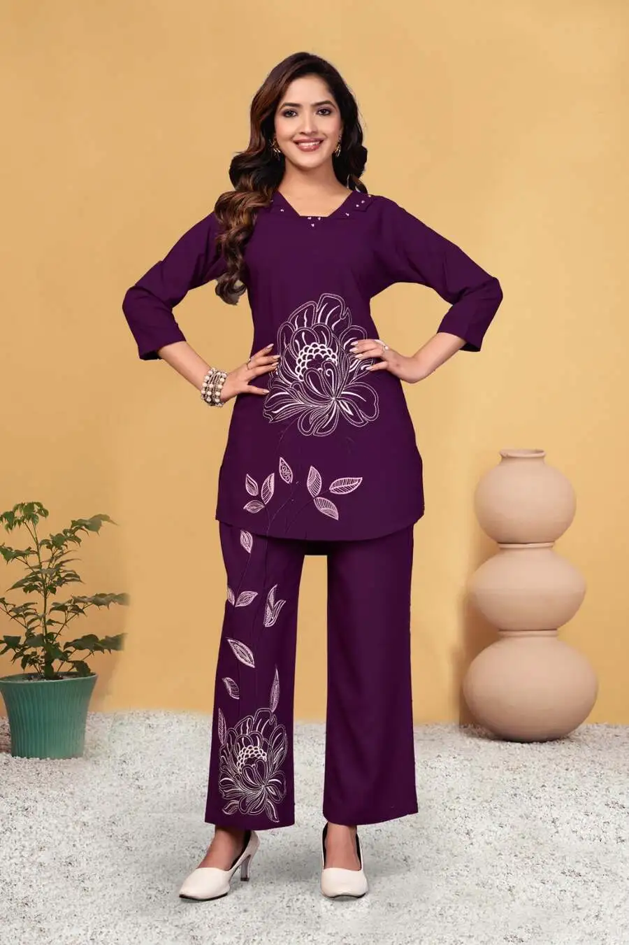 TRENDING RAYON MULTI EMBROIDERY THREAD WORK WITH HAND WORK CO-ORD SET WINE