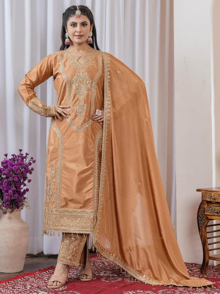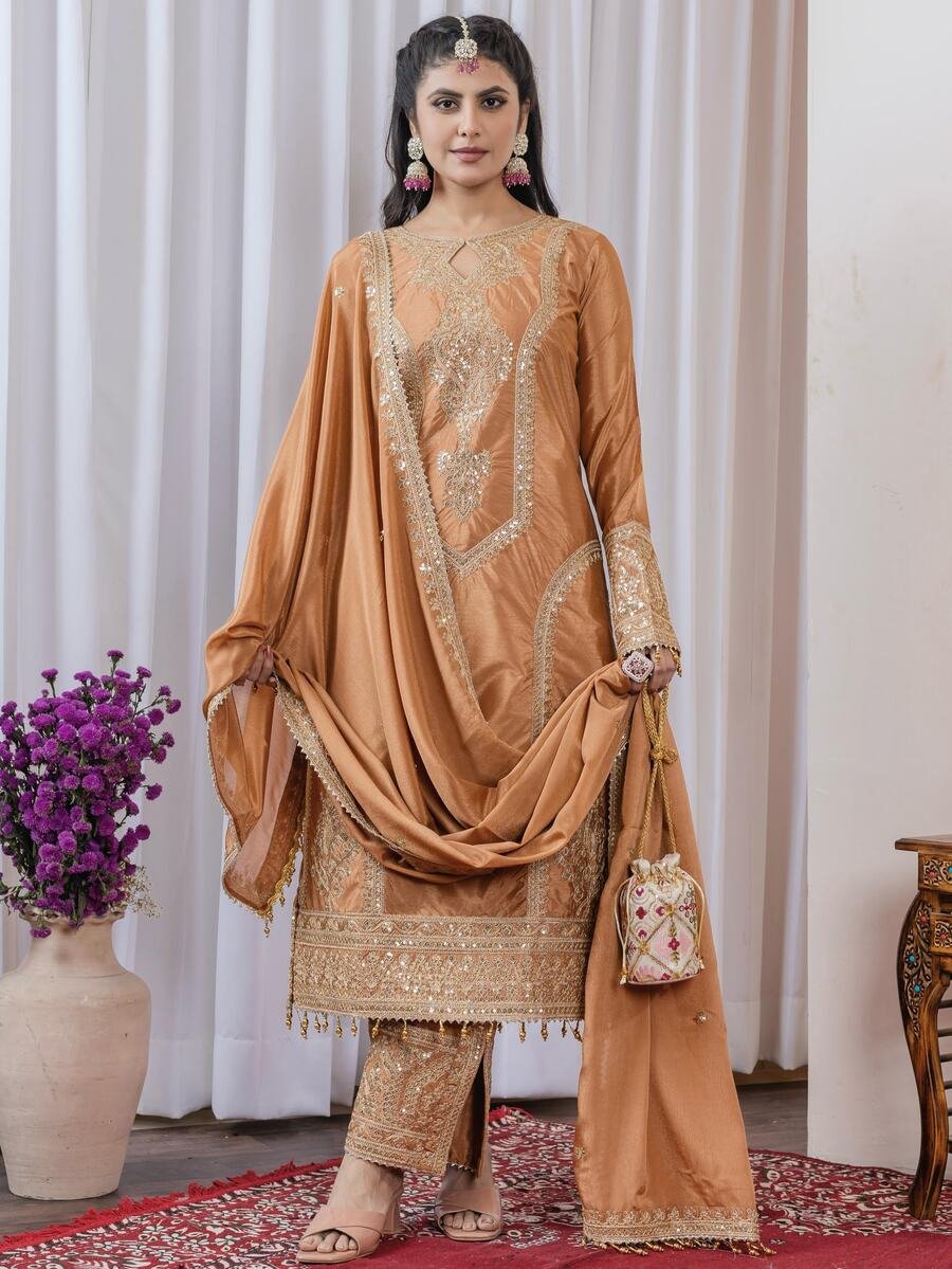TRENDING SILK EMBROIDERY TOP PALAZZO WITH DUPATTA CHIKU