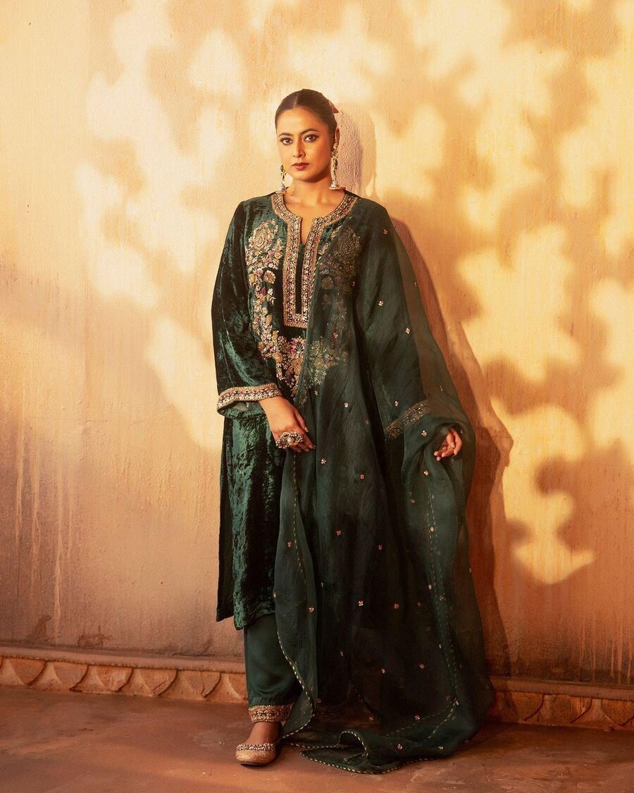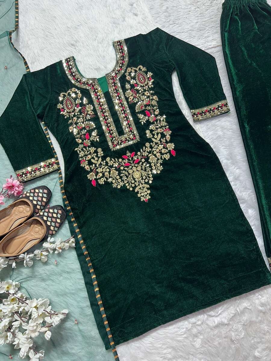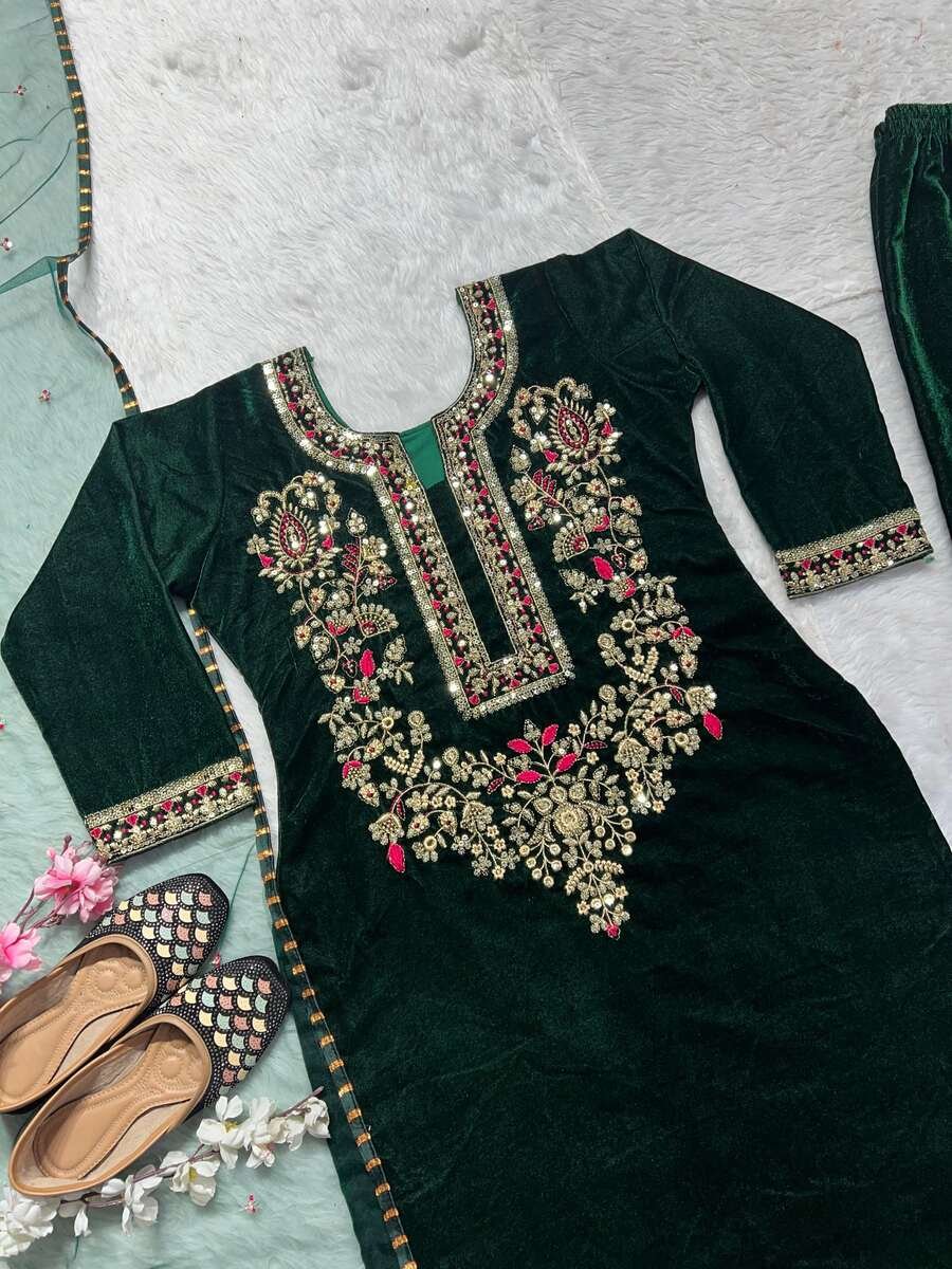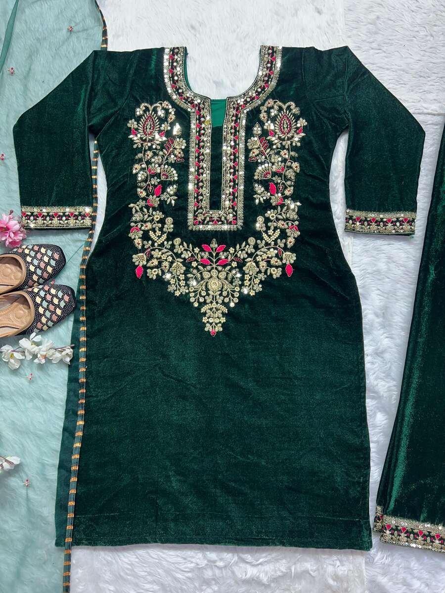 TOP FABRIC : HEAVY VISCOSE VELVET WITH HEAVY EMBROIDERY SEQUENCE WORK WITH FULL EMBROIDERY SLEEVE