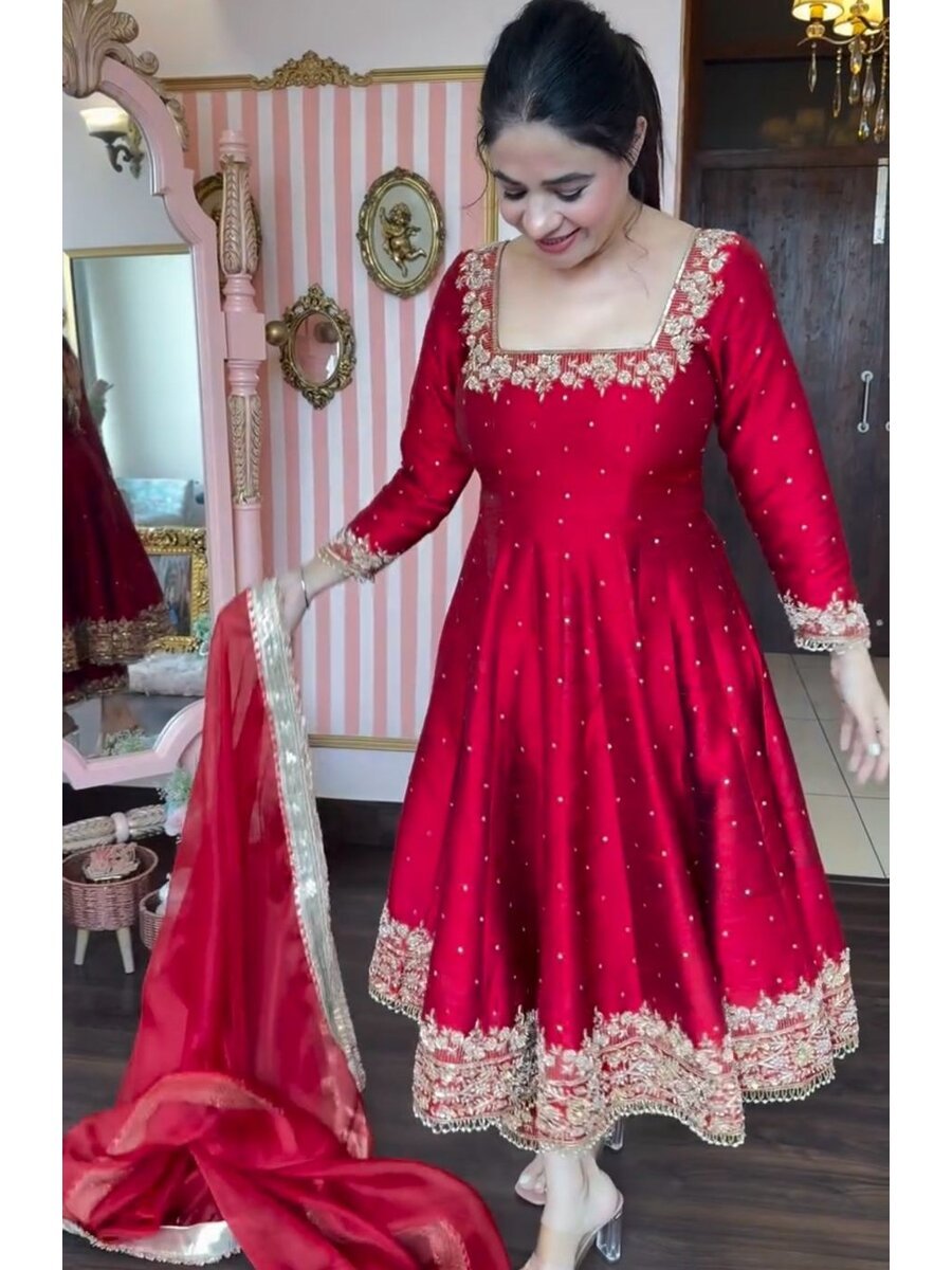 GOWN FABRIC :- HEAVY PURE VICHITRA SILK WITH EMBROIDERY 5 MM SEQUENCE WORK WITH FANCY LATKAN BORDER WITH SLEEVE WITH CUPS & TASSELS