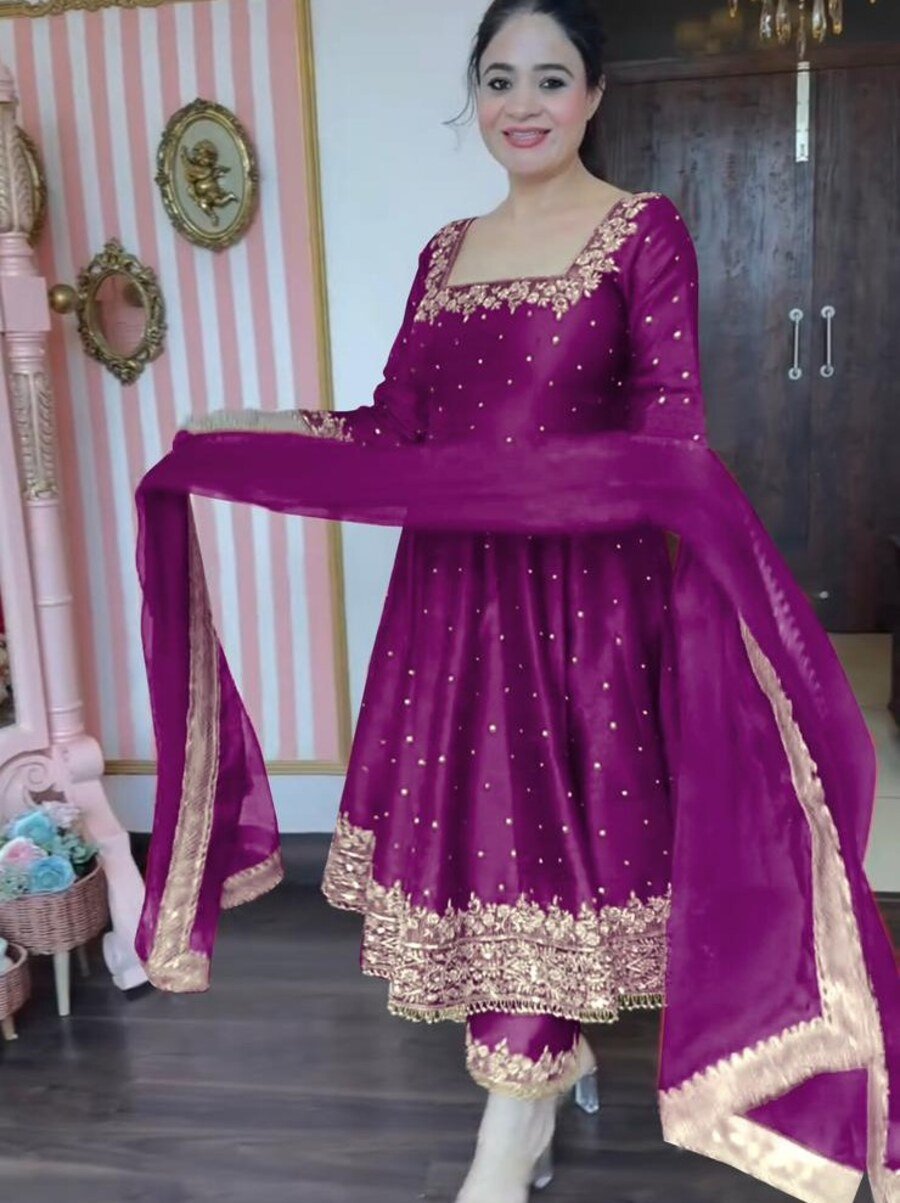 GOWN FABRIC :- HEAVY PURE VICHITRA SILK WITH EMBROIDERY 5 MM SEQUENCE WORK WITH FANCY LATKAN BORDER WITH SLEEVE WITH CUPS & TASSELS