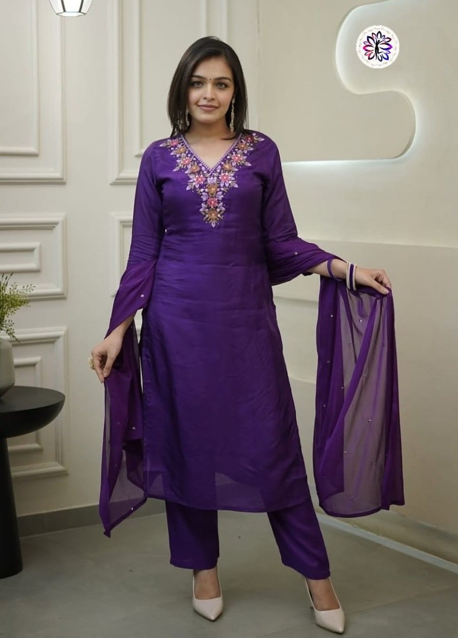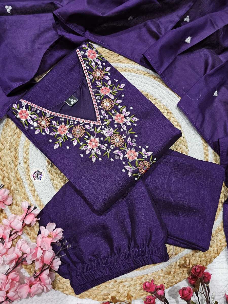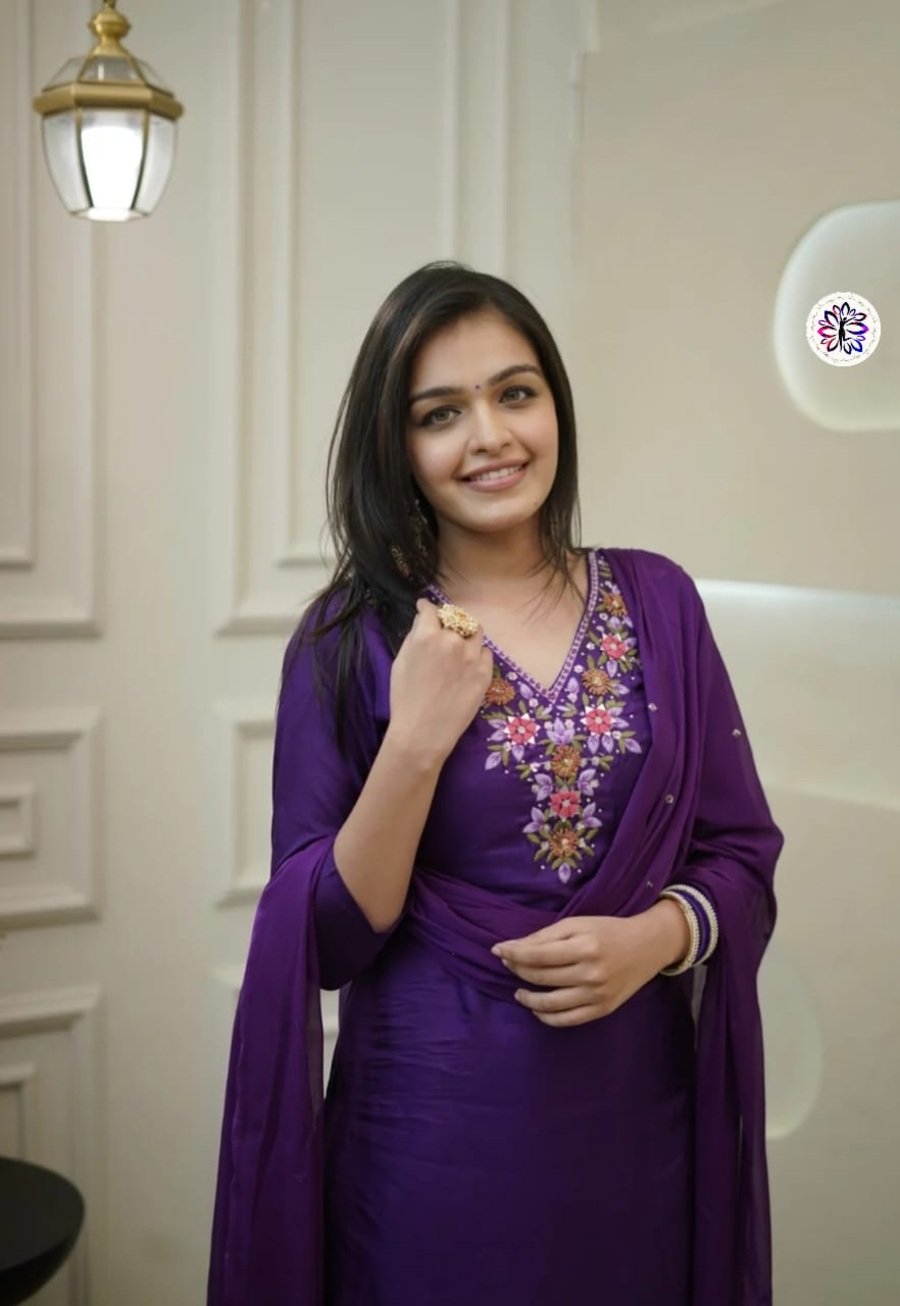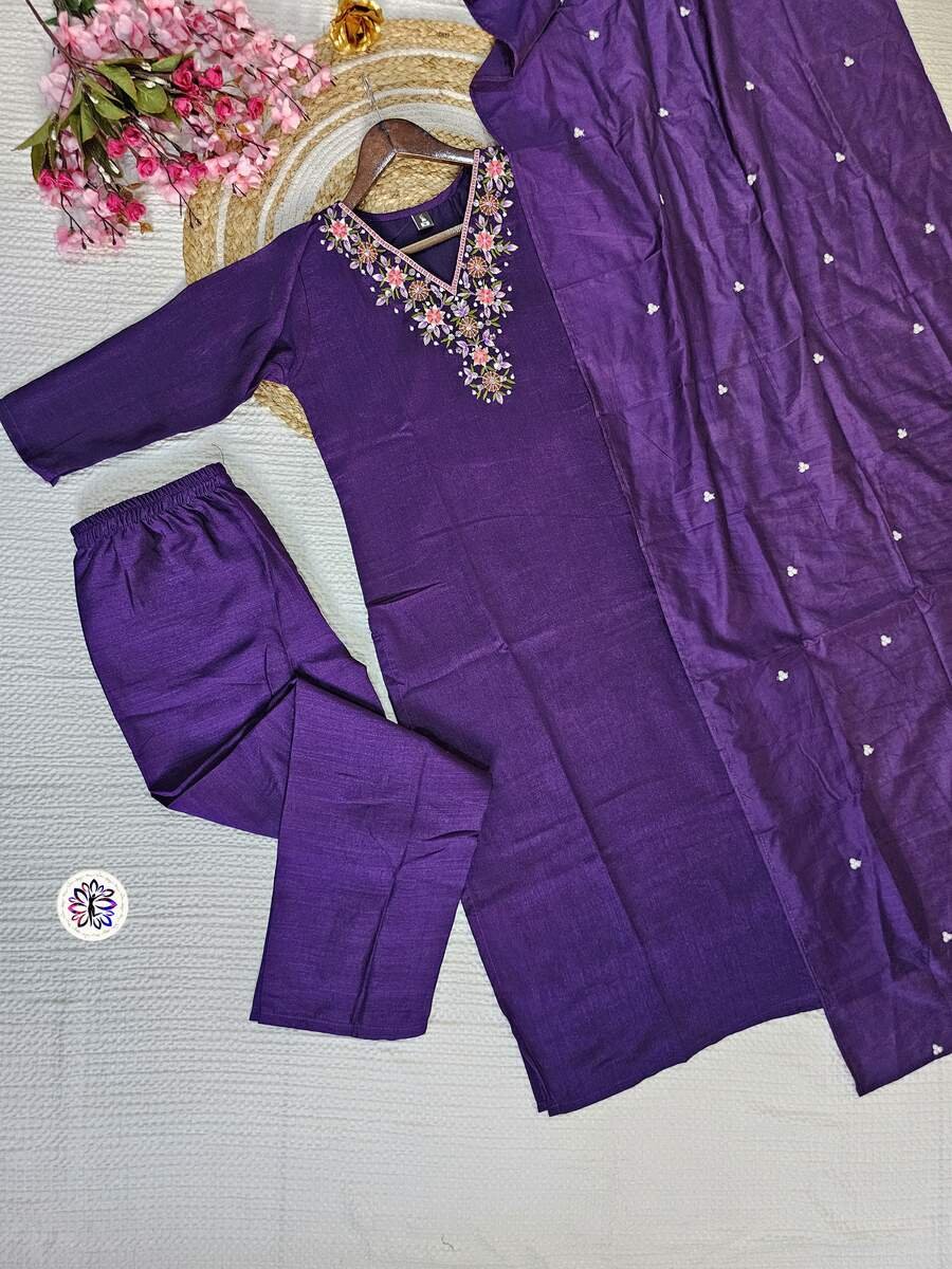 TRENDING VICHITRA SILK EMBROIDERY SEQUENCE WORK TOP BOTTOM WITH DUPATTA PURPLE