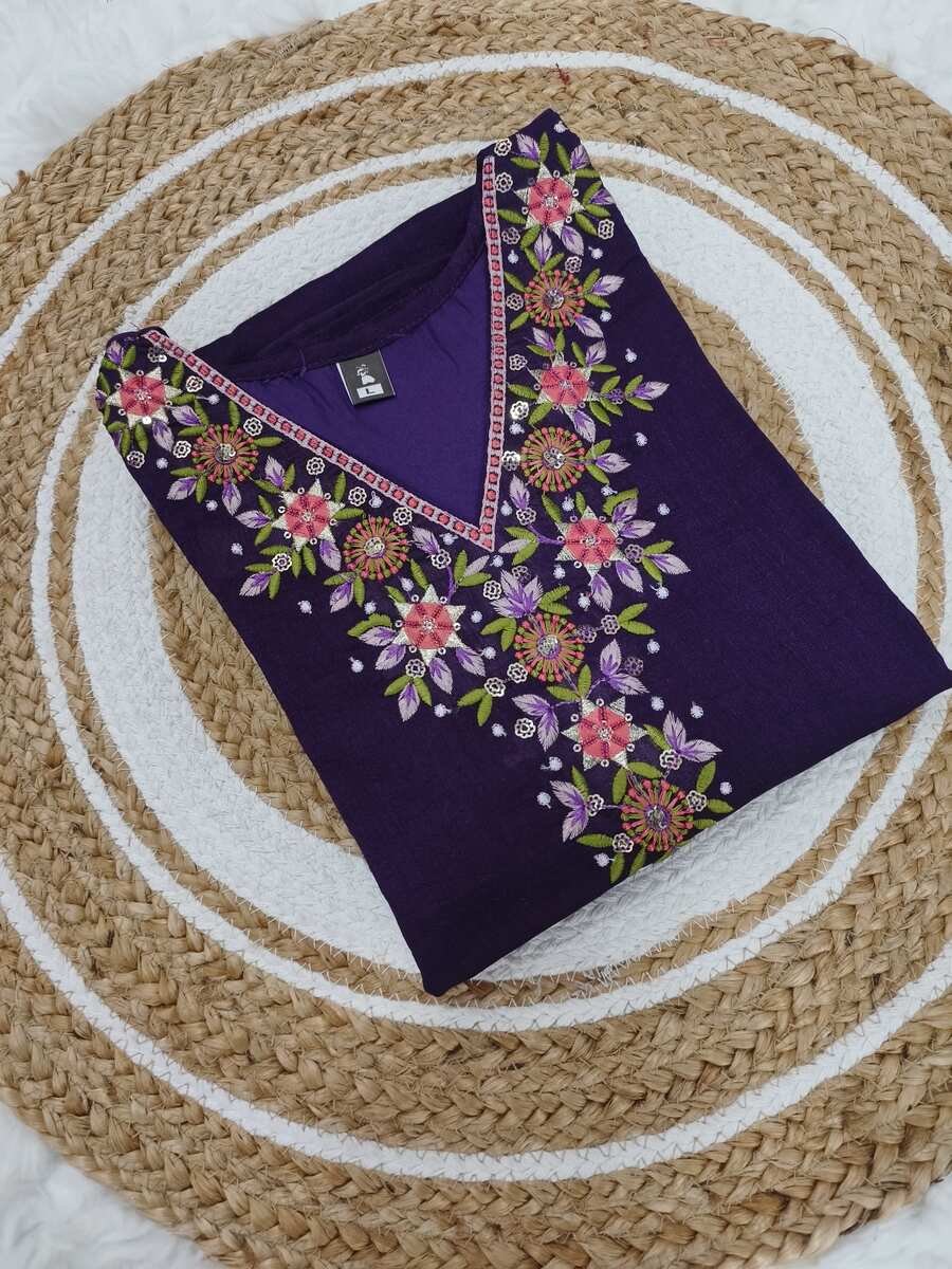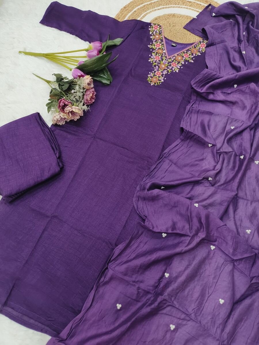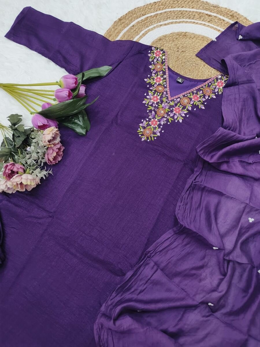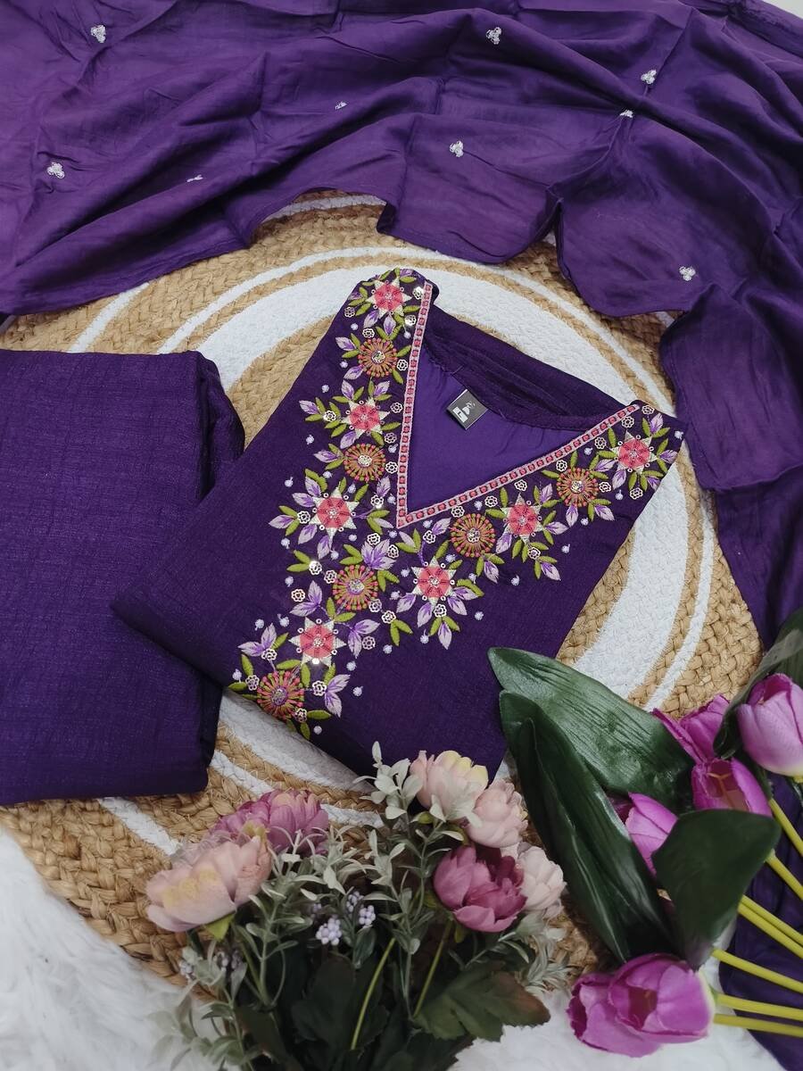 TRENDING VICHITRA SILK EMBROIDERY SEQUENCE WORK TOP BOTTOM WITH DUPATTA PURPLE