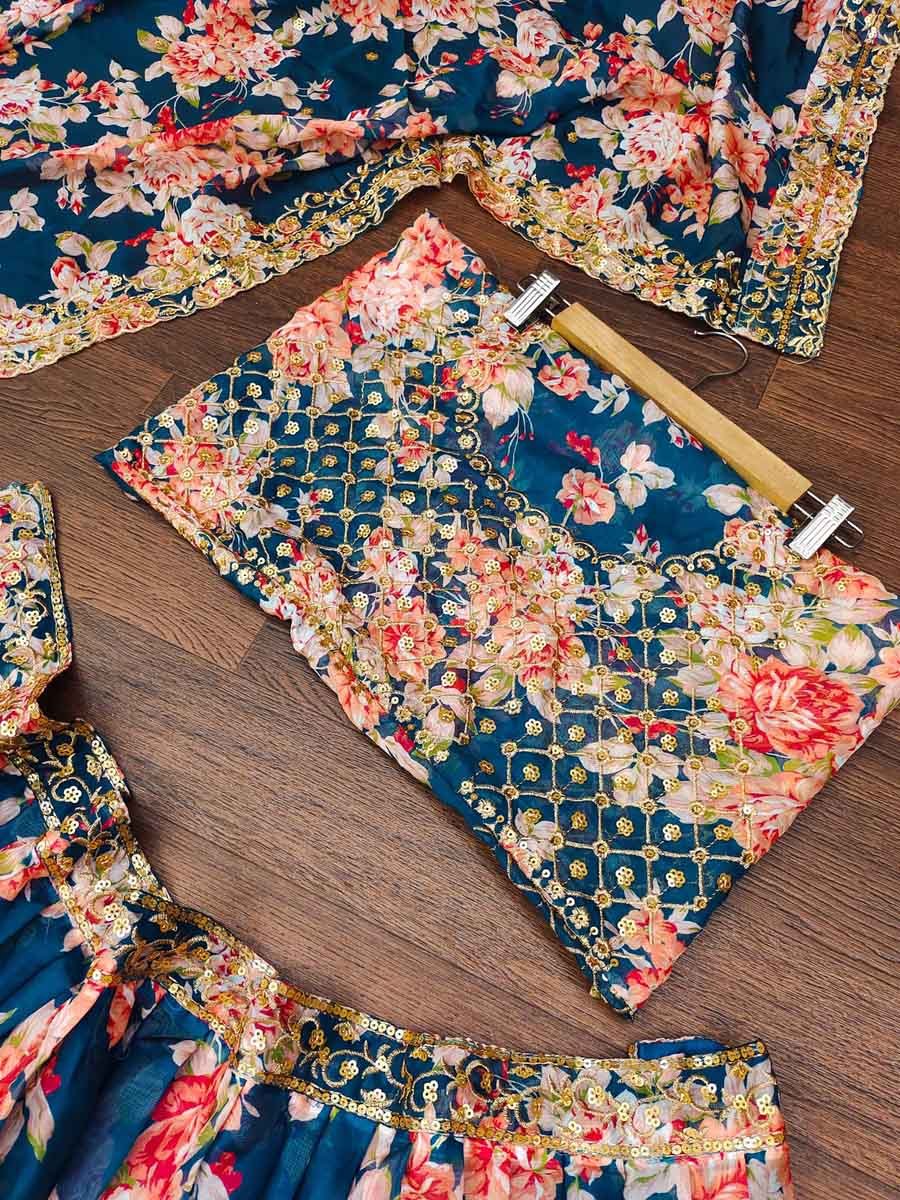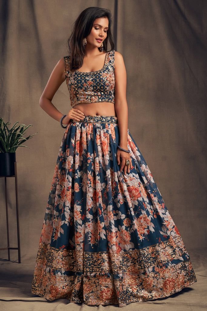 DESIGNER SOFT ORGANZA WITH DIGITAL PRINT WITH HEAVY EMBROIDERY JARI SEQUENCE WORK LEHENGA CHOLI WITH DUPATTA NAVY BLUE